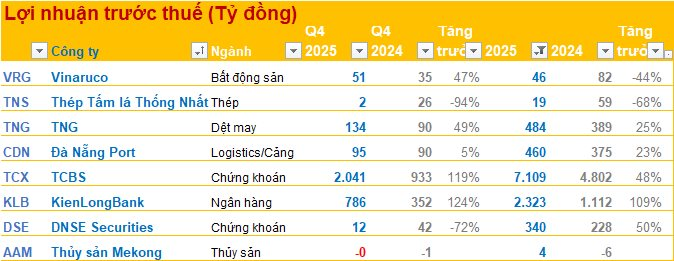 Trong lĩnh vực bất động sản, Vinaruco (VRG) ghi nhận một quý 4 tương đối khả quan với lợi nhuận đạt 51 tỷ đồng, tăng trưởng 47%. Tuy nhiên, tính chung cả năm 2025, lợi nhuận của VRG vẫn sụt giảm 44%, chỉ đạt mức 46 tỷ đồng.
